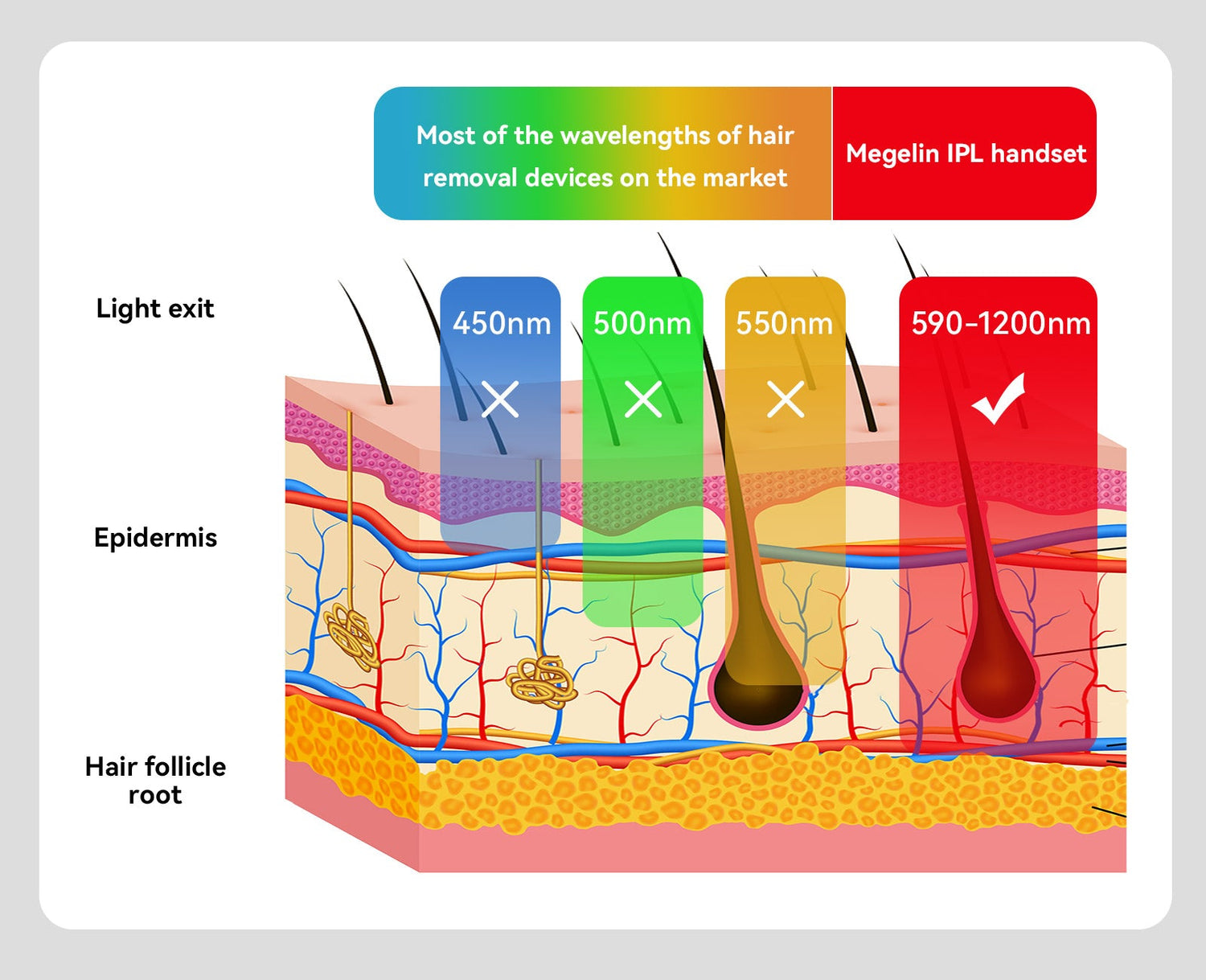 590-1200nm wavelength, salon-grade precision band, high penetration, direct action on the hair follicle, no wasted light energy, one session is equivalent to two sessions with other devices.