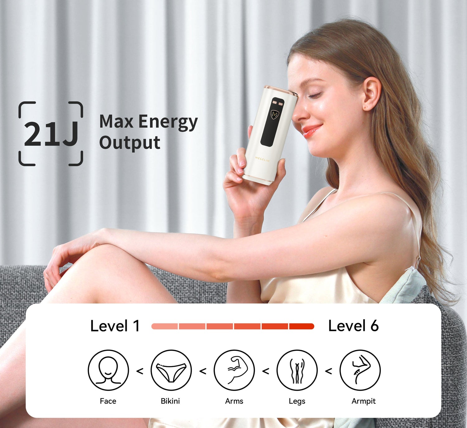 Powerful 21J energy for removing dense and fast-growing hair. Additionally, personalized hair removal customization for sensitive areas. With 1-6 energy intensity levels, ensure effective and precise hair removal without damaging the skin.
